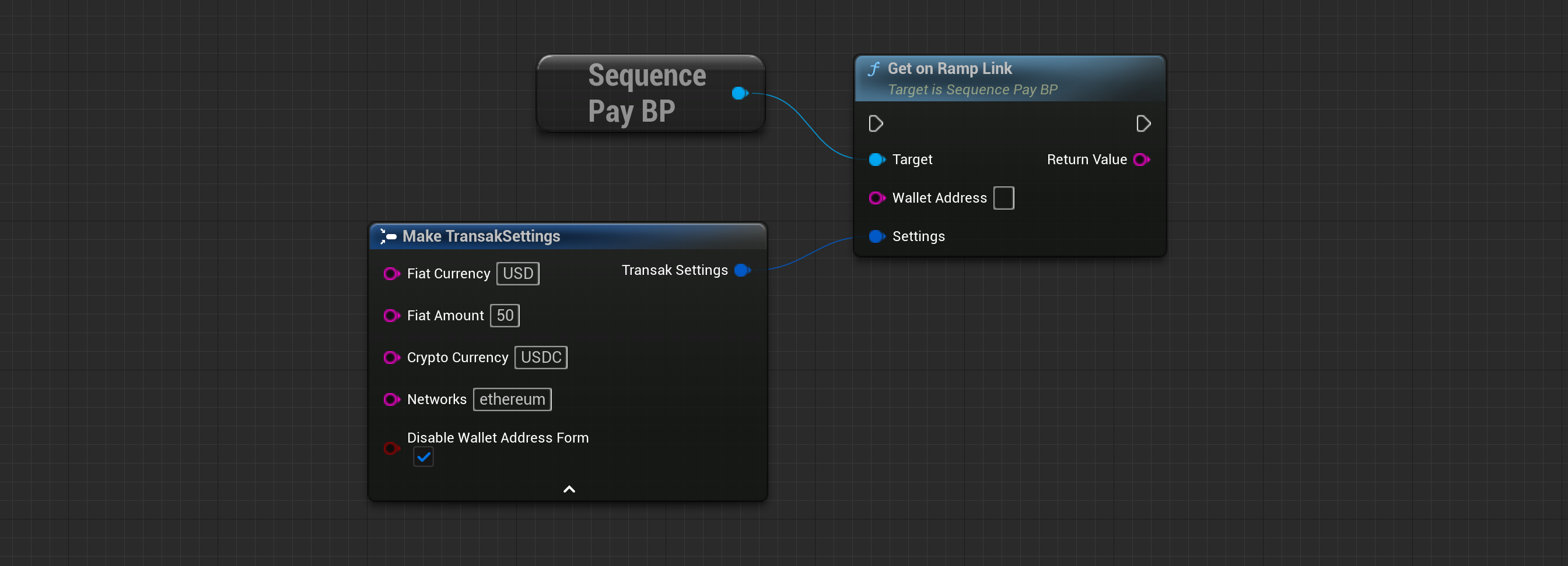 Wallet Address (FString)The address of the user who receives the purchased amount of cryptocurrency.Fiat Currency (FString)The default fiat currency displayed in the On-Ramp modal.Fiat Amount (FString)The default fiat amount displayed in the On-Ramp modal.Crypto Currency (FString)The cryptocurrency the user is allowed to purchase.Networks (FString)List of networks the user can select, separated by a comma. For example: ‘ethereum, mainnet’.Disable Wallet Address Form (Boolean)Set this value to ‘false’ to allow users to edit their wallet address.